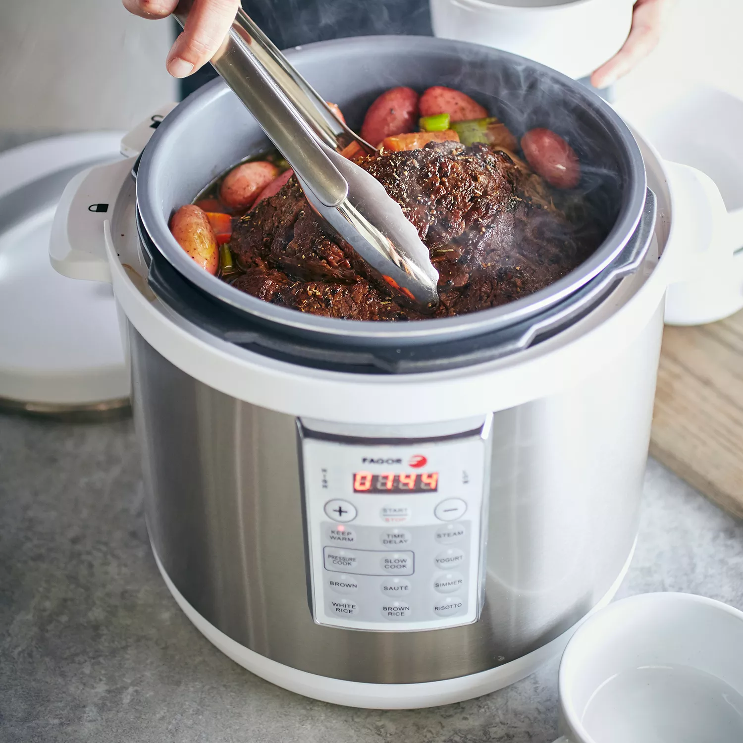 Remove the roast and add the 3 carrots, celery and onion to the cooker. Set the meat on top of the vegetables and add the stock. Close and lock the lid of the multi-cooker and set the regulator knob to PRESSURE. Set the timer for 35 minutes on pressure cook HIGH. Use the natural release method to depressurize the cooker.