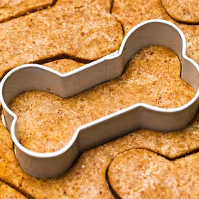 Using a bone-shaped cookie cutter, cut out shapes and transfer the cut outs to the lined baking sheet. Re-roll dough scraps and cut out additional shapes.