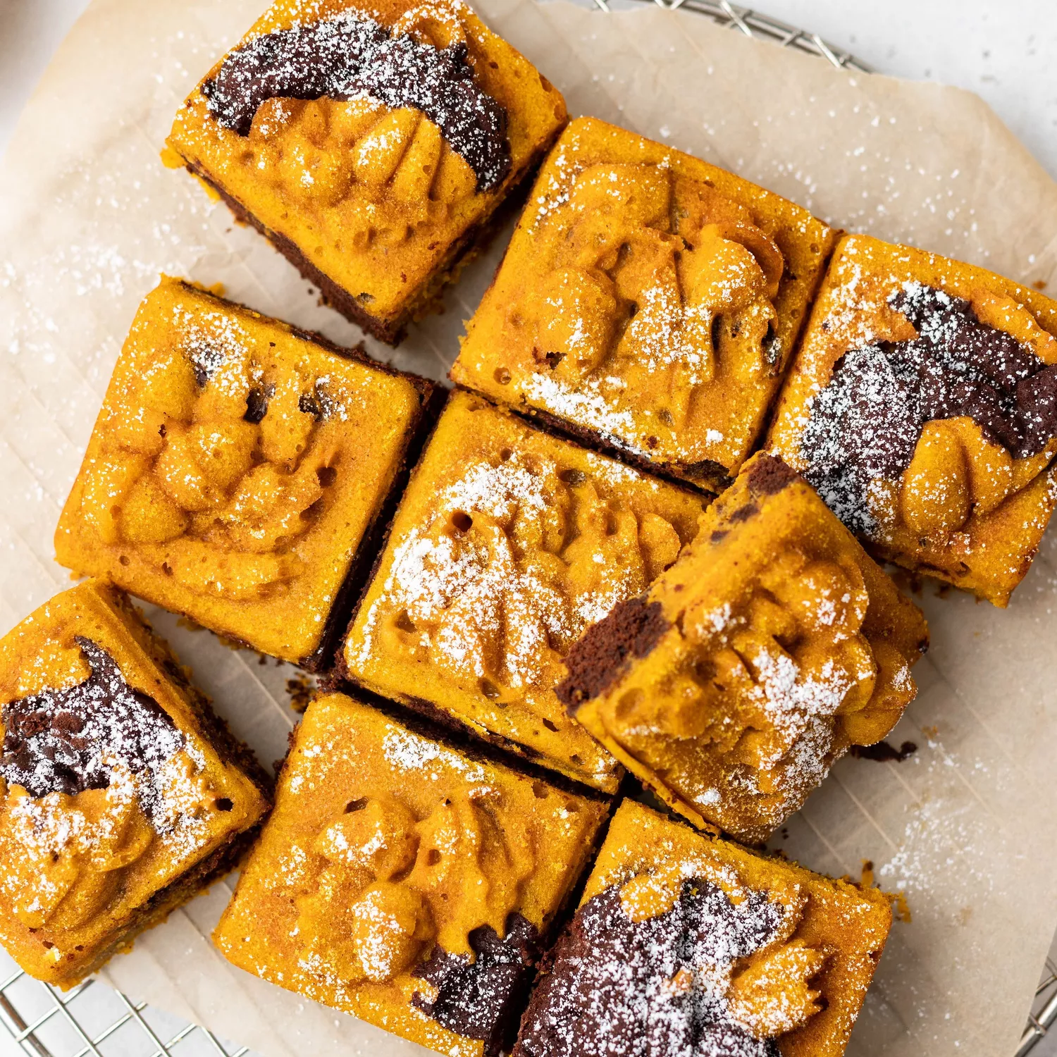 Spray a 8x8 cake pan with nonstick baking spray. Add both the chocolate and pumpkin batter, alternating between the two.
