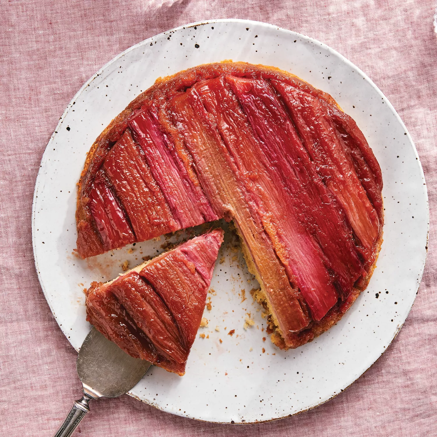 Invert a serving platter or cake plate over the pan and, using oven mitts for protection, flip the whole thing over. The cake should slip right out of the pan, but if not, knock the plate against the counter a few times to loosen the cake. Any rhubarb that sticks to the pan can be removed with an offset spatula and returned to the cake.