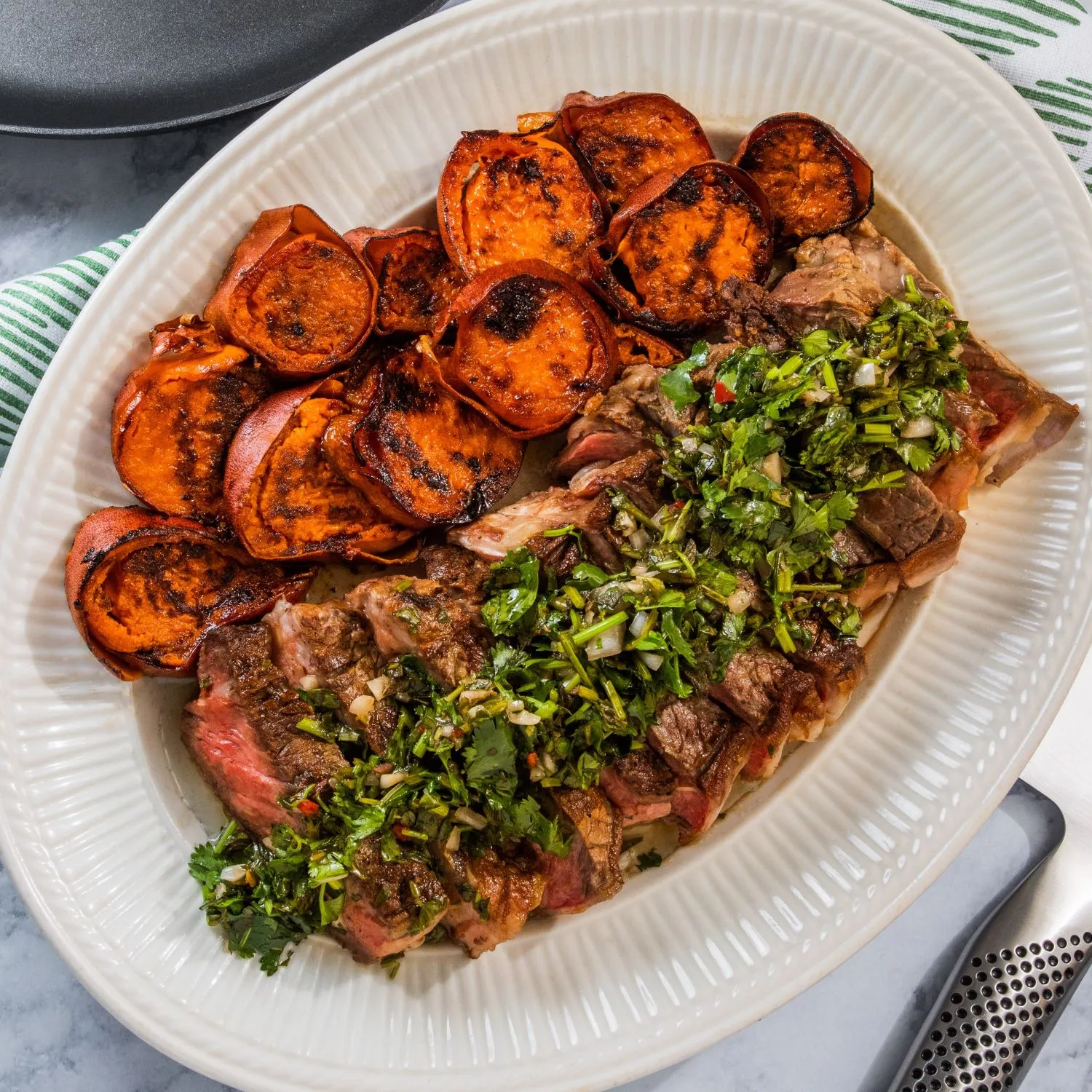 To serve: Slice your ribeye against the grain and plate alongside your sweet potato rounds. Top with chimichurri.