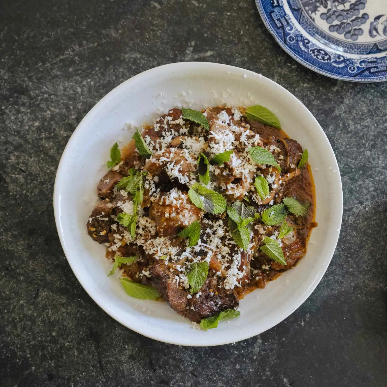 It took me a minute (and a trip to England) to realize that beef shins were the same cut as osso bucco. Beef shins are always a great deal and deliver so much rich intensity for the investment. It takes a long, slow background braise to cook the meat, but it’s almost completely passive—no need to fidget or fuss with the pan. A little bit of anchovy in the pan, along with some lemony coriander seed, helps add complex savory tones to the delicious meat. And I like to serve it with something brisk and fresh, like a shower of freshly grated horseradish and slivered mint leaves. This is great with a simple salad and crusty bread or roasted vegetables.