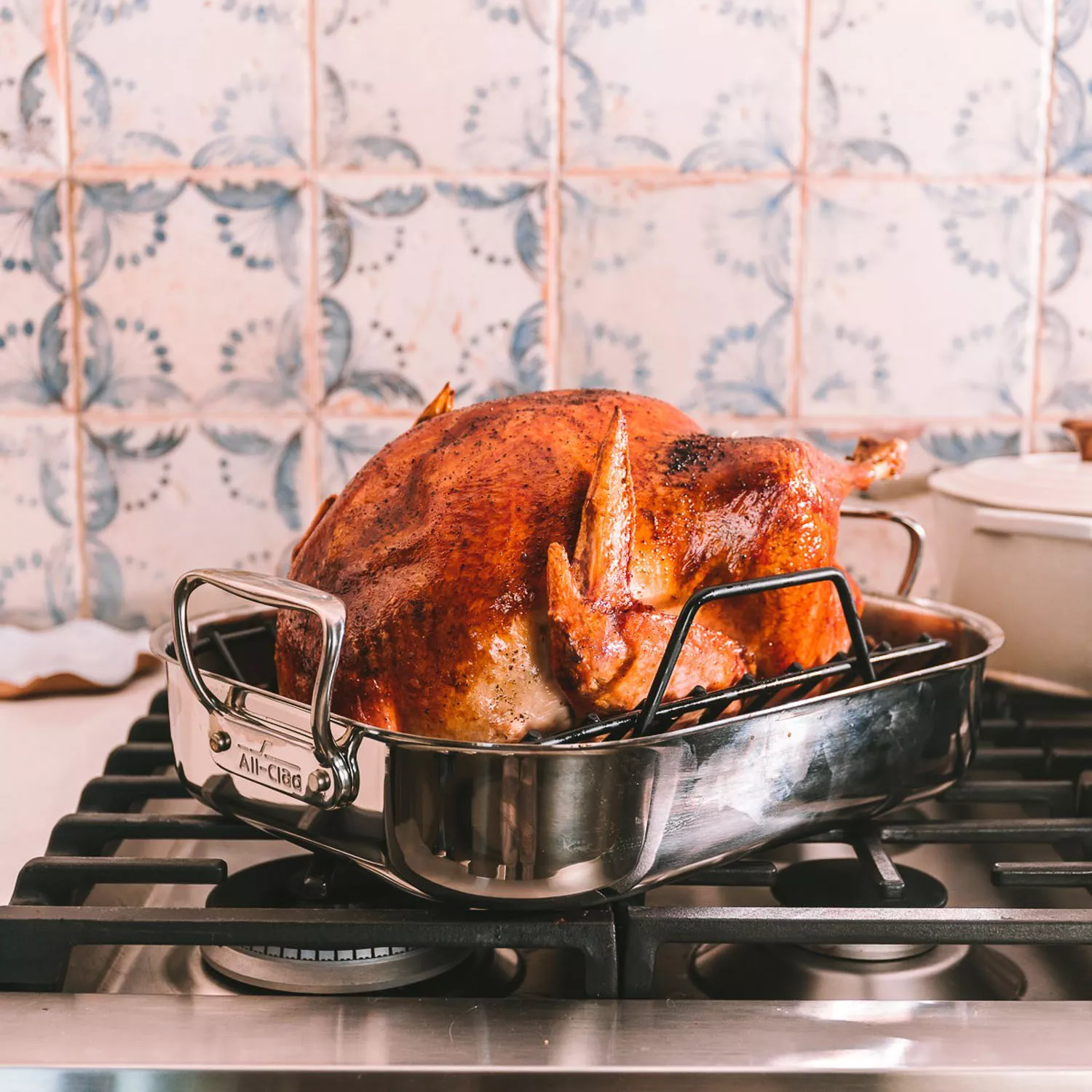 Place the rack on top and settle in the turkey on top. Remove the neck and gizzards from the cavity and reserve for stock.