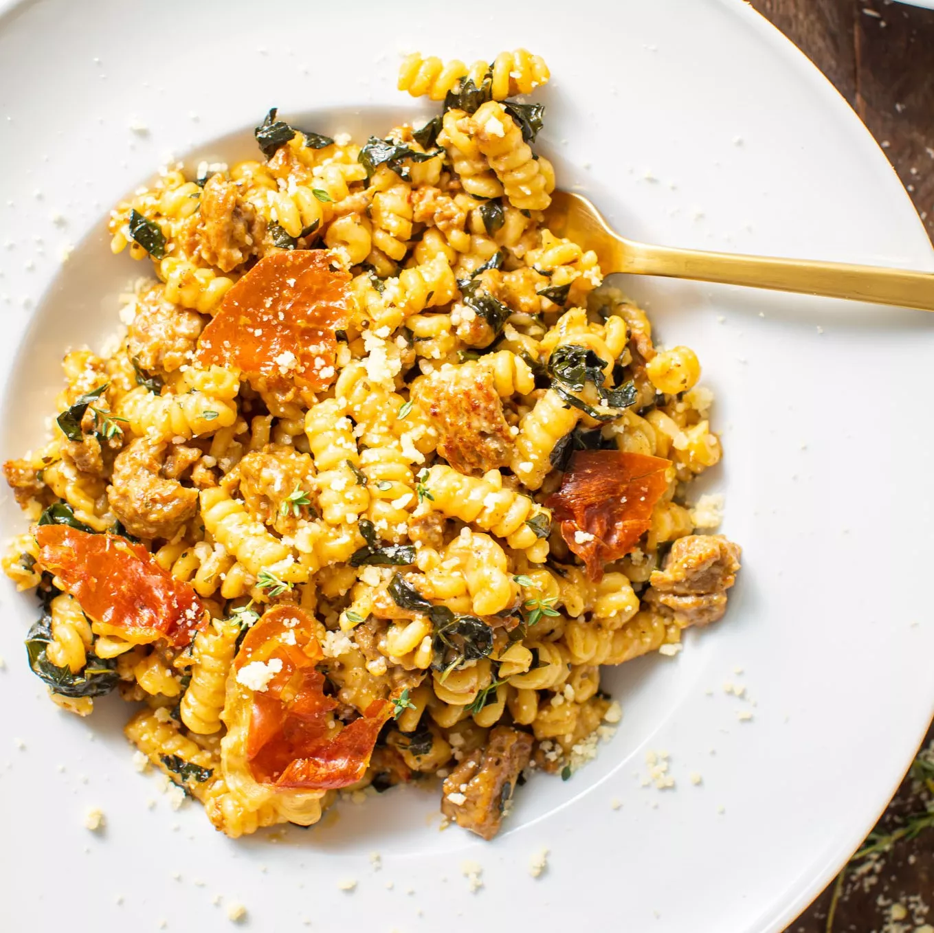 Create a little well in the center of the pan and add the mascarpone. Use a wooden utensil to stir in the mascarpone until it all completely melts through. This should happen pretty quick as the pan will be hot. After it melts through, stir the sausage/kale mixture around with the mascarpone to fully combine.