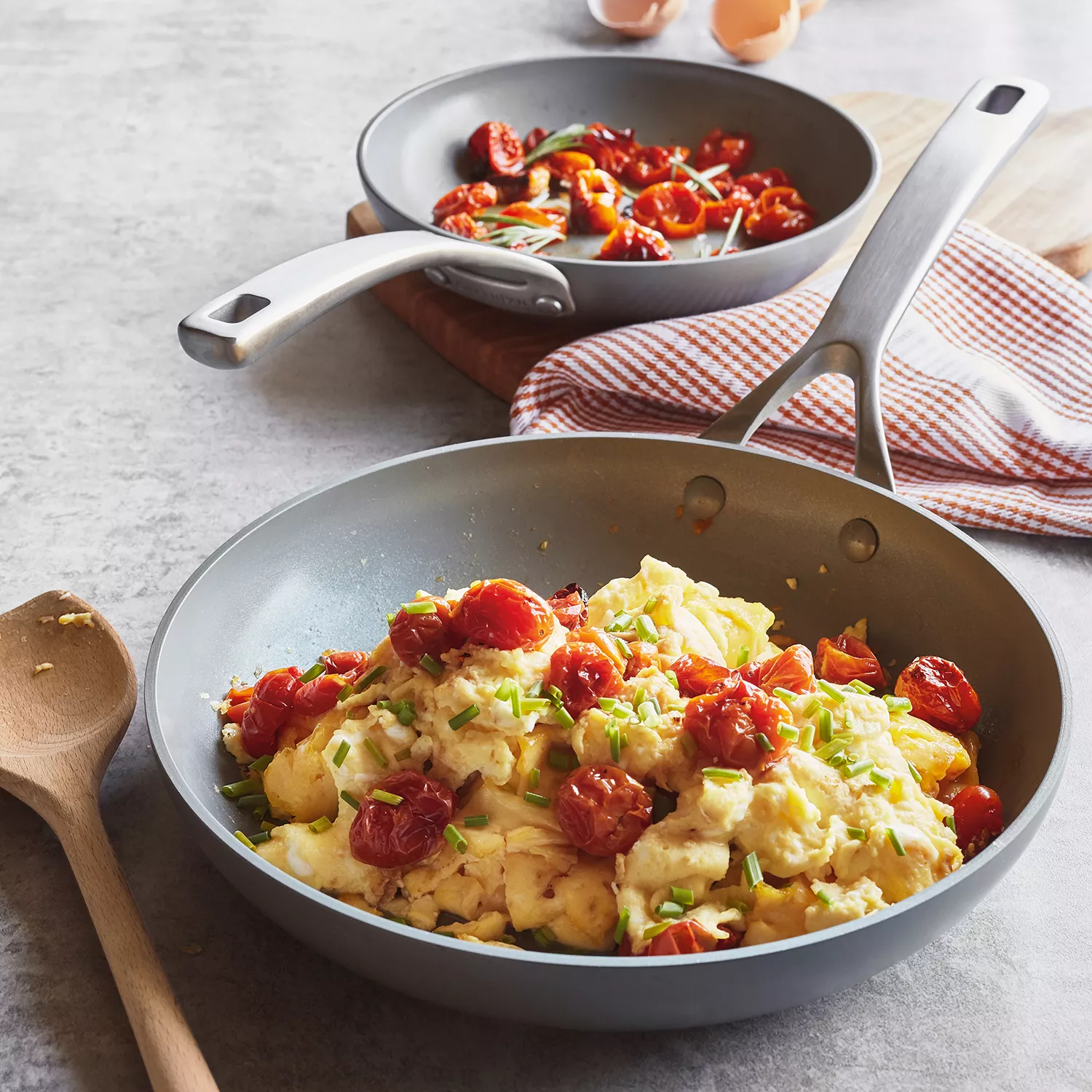 Divide eggs between 4 plates and top with blistered tomatoes, garnish with chopped chives, and season with salt and pepper. Serve immediately.