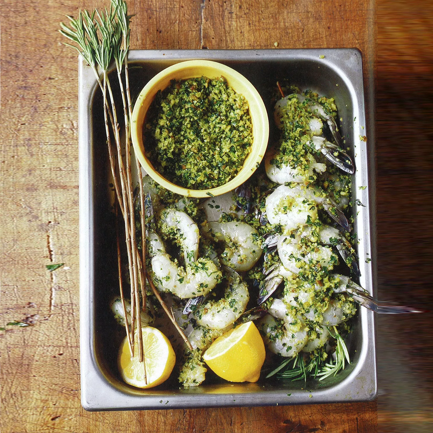 Skewer 4 or 5 shrimp on each rosemary sprig (the easiest way to do this is line up 4 or 5 shrimp at a time on a work surface and run a skewer through them; then separate them slightly so they will cook evenly). Dredge on both sides in the bread crumb mixture, place on a platter, and put in the refrigerator for 30 minutes.
