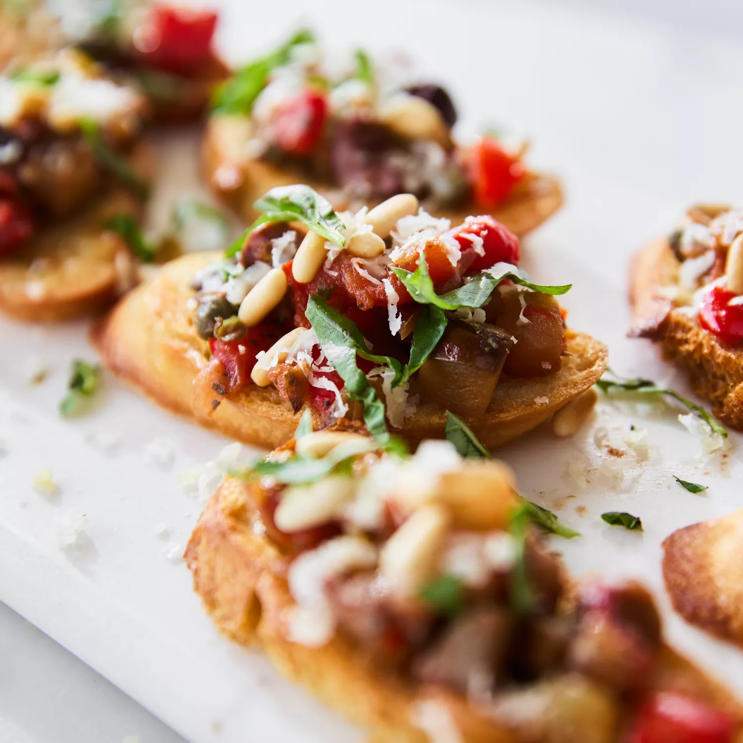 Top each slice of grilled bread with a heaping tablespoon of caponata, drizzle with olive oil and garnish with toasted pine nuts, basil and shaved Parmigiano-Reggiano. Arrange on a platter and serve immediately.