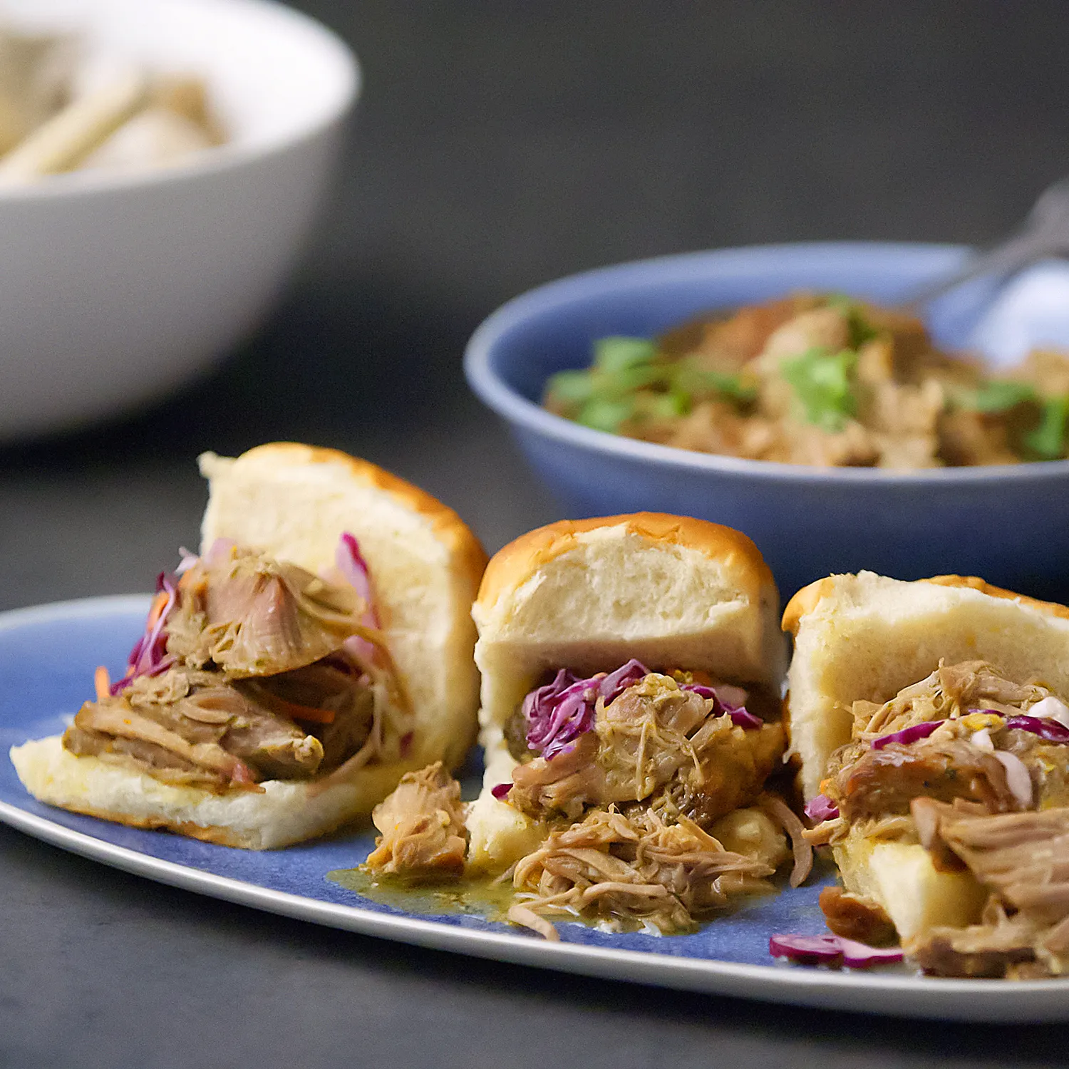 The pork can be marinated in the citrus-herb-garlic paste for up to 24 hours before slow roasting. Mojo is the Portuguese word for sauce and has many versions, but what they all have in common is that they are highly flavored with acidic ingredients like the citrus here and have cumin. This pork can be served as a main dish with sides, as a sandwich, or get creative with it in a salad or grain bowl.