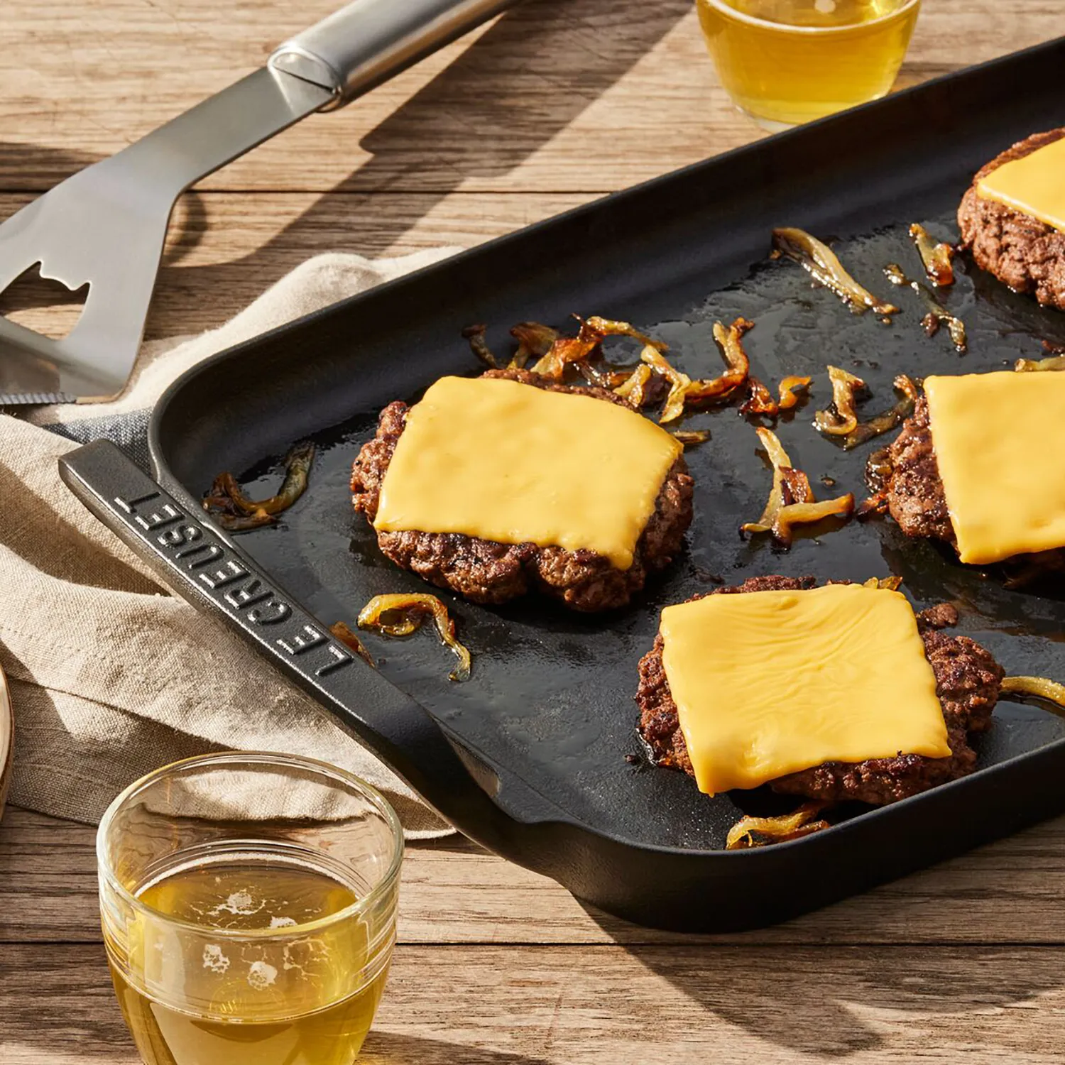 1. Heat the Alpine Outdoor Collection Rectangular Griddle on medium heat. Add olive oil and add onions, spreading them out in the pan. Sauté the onions until they are softened and caramelized, stirring occasionally. After about 10 minutes, sprinkle the onions with ½ teaspoon Kosher salt to help break them down, and add a little water to the pan if the onions seem too dry. Continue cooking for 30-45 minutes more, lowering the temperature if the onions are beginning to burn. Remove the onions from the griddle.