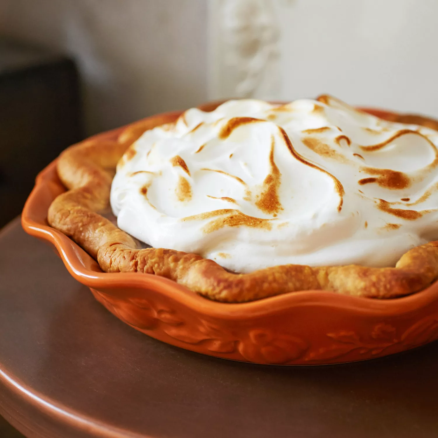 Transfer the hot egg whites to the bowl of the stand mixer. You can also use a hand mixer and a medium bowl. Whip on high speed until the whites have cooled to room temperature, increased in volume and resemble marshmallow fluff. Spoon the meringue into the pastry bag. Pipe the meringue into the pie shell, starting at the outside circling inward, then upward, covering the entire surface. Place the pie on a baking sheet and make sure that nothing nearby might catch fire. Using a chef’s torch, igniteyour torch and lightly glaze the meringue with the tip of the flame, rotating the baking sheet to toast all the sides. The meringue will brown instantly so move quickly; don’t hold the flame in one place for long. Serve immediately or refrigerate until serving time.