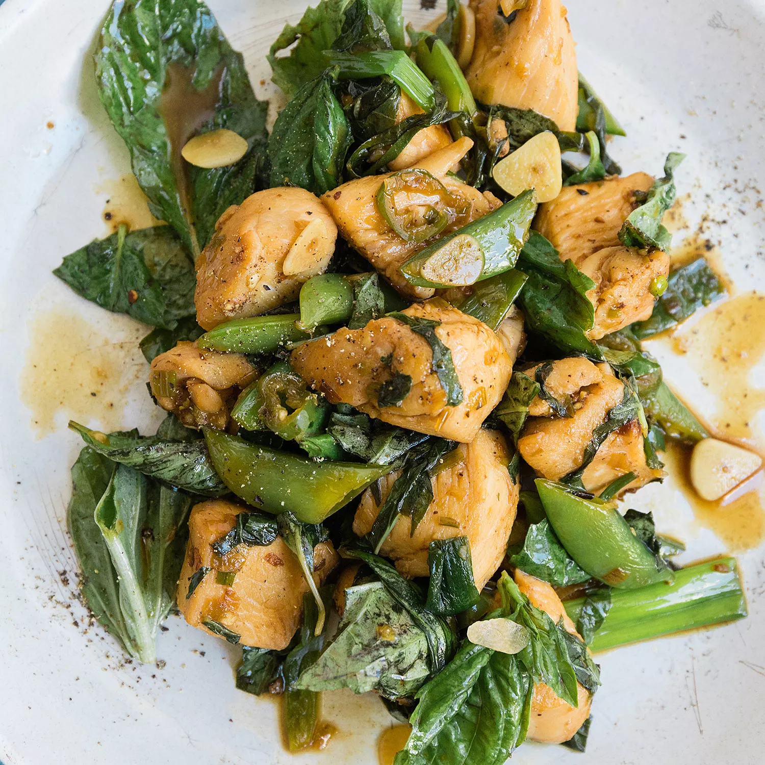 Using both chopped basil (mixed with the cooked chicken) and whole basil leaves (stirred in at the end) provided the full herbal flavor and fragrance we were looking for. Serve with steamed white or brown jasmine rice.