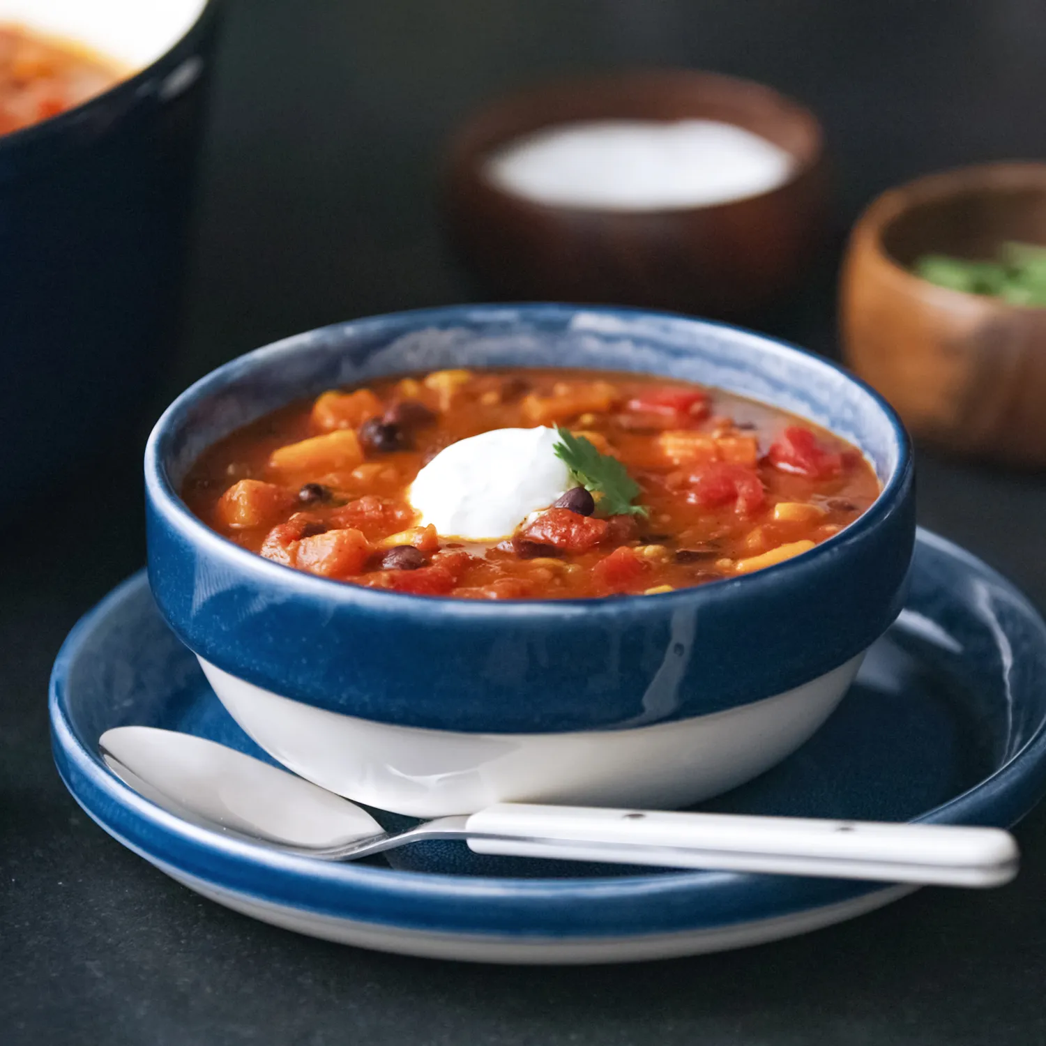 4. To serve: Divide the chili between bowls, top with a dollop of crema and fresh cilantro.