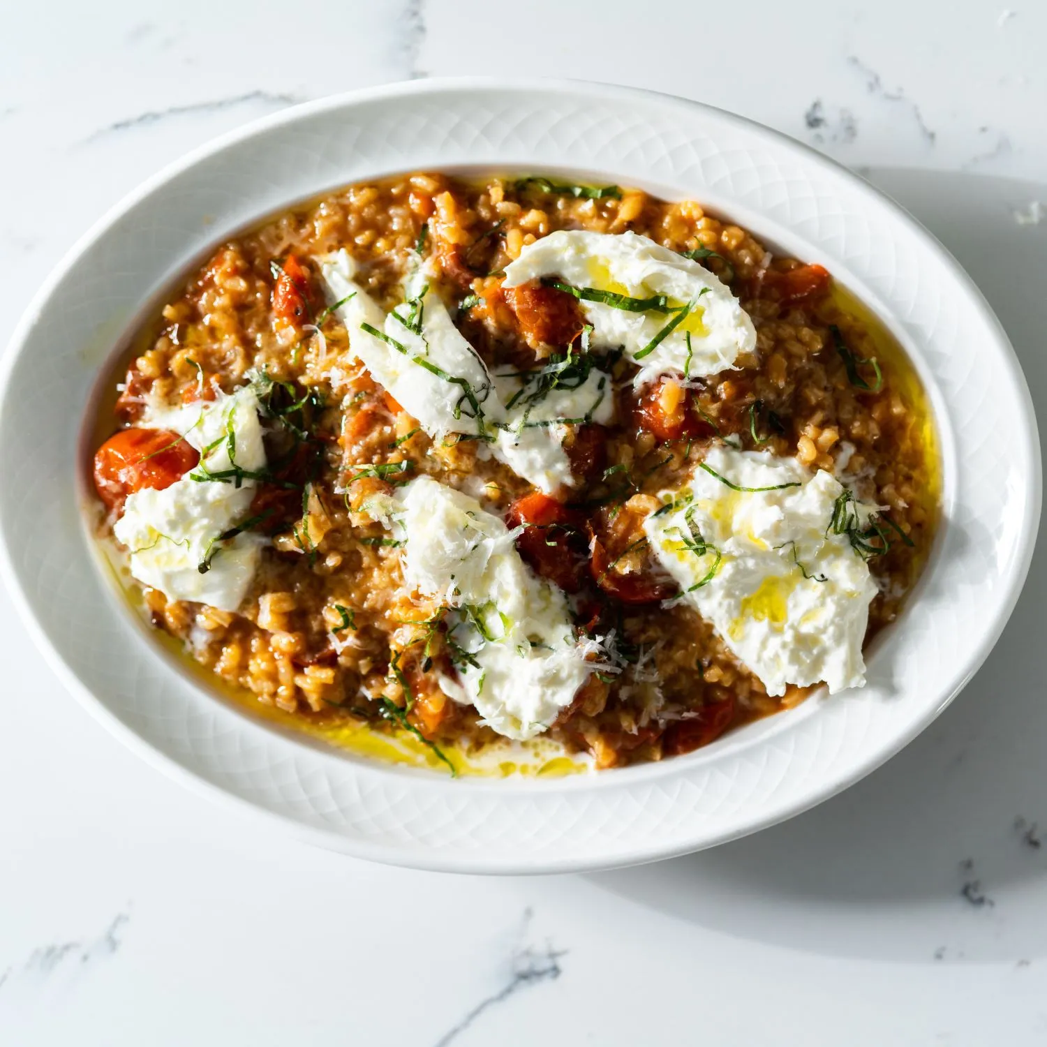 Allow the risotto to sit for a few minutes to set and then serve with additional burrata, grated parmesan and basil chiffonade.