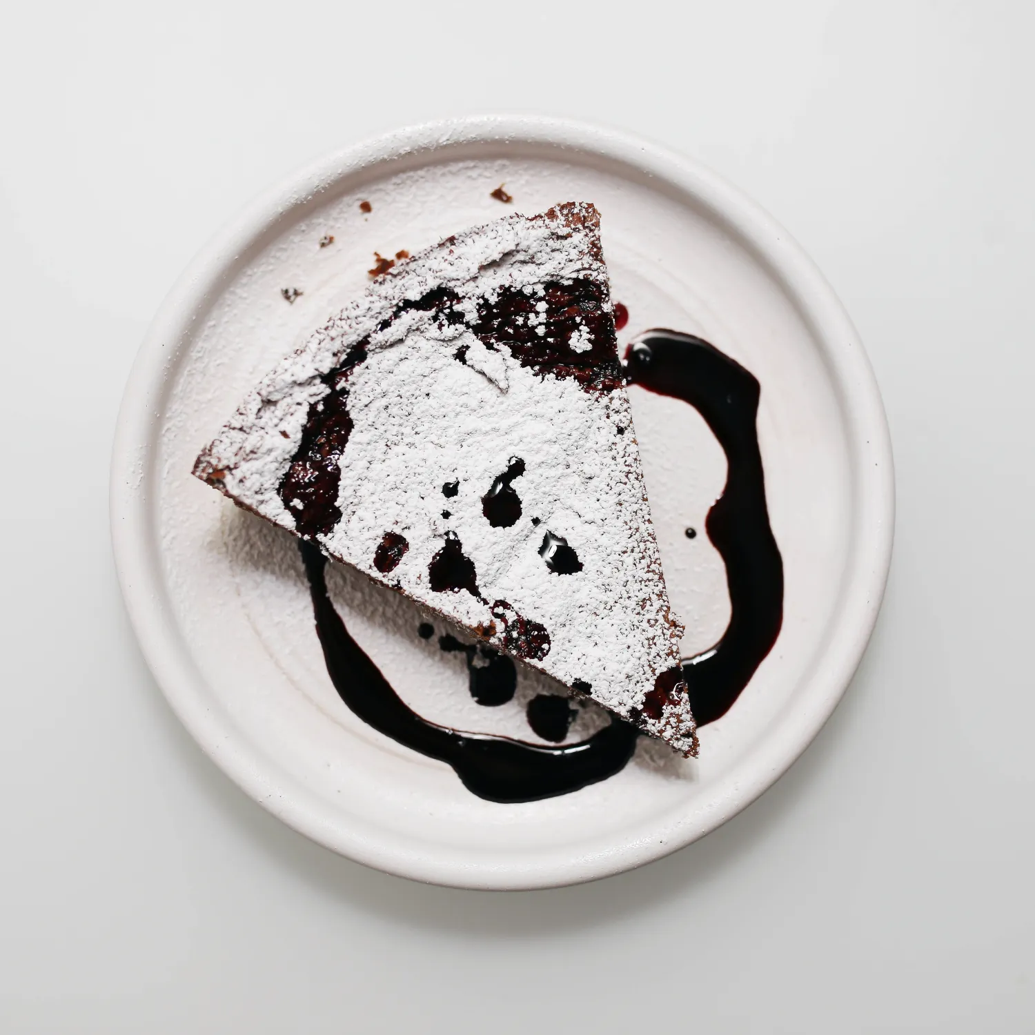 Carefully unmold the cake, peel off the parchment paper, and invert onto a serving dish so the crackly surface is on top. Generously sift powdered sugar over the top and drizzle with the lambrusco sauce. Enjoy!
