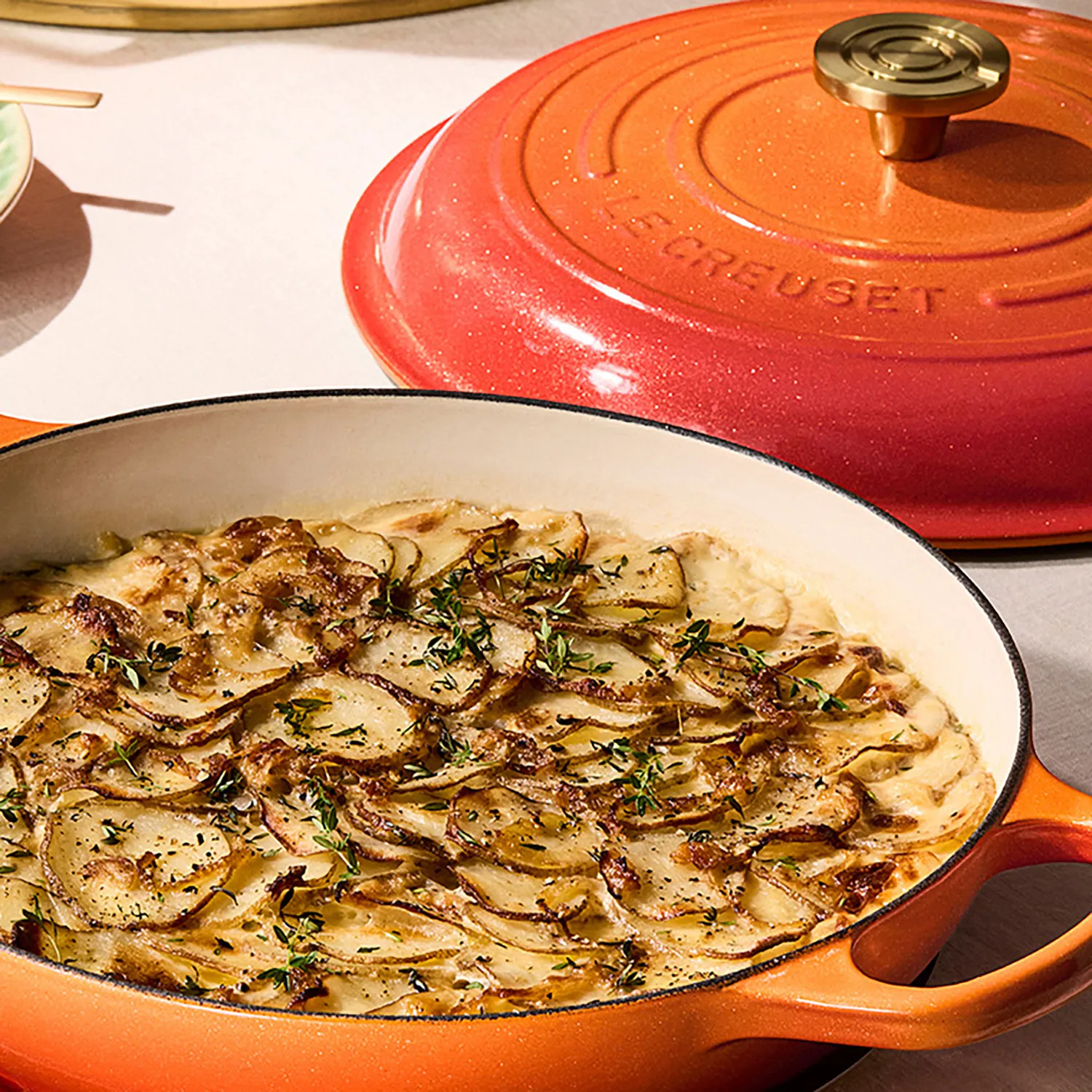 - Preheat the oven to 400 degrees. Prepare a 3.5 qt braiser with butter or cooking spray. Cut the potatoes in ⅛ inch slices using a sharp knife or mandoline. Arrange the potato slices in circles, slightly overlapping, in the bottom of the braiser, and add ¼ teaspoon salt to each layer before beginning the next layer.
