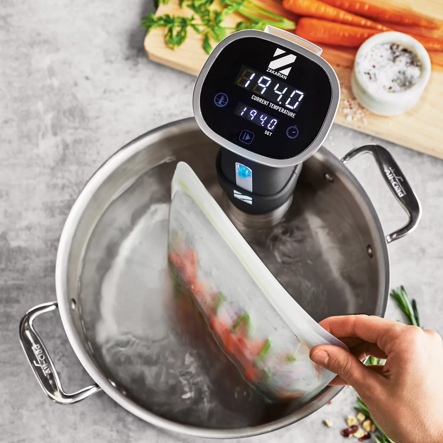 Place bag into preheated water, clip to side of pot and let cook, fully submerged, for 1 hour.