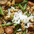 To prepare pasta: Place a large nonstick skillet on the stove over a moderate heat and add the oil. When the oil is shimmering, add the cooked sausages and cook until browned, about 4 minutes. Add the beans and cook until heated through, about 2 minutes. Add the cooked pasta and pesto and toss until well combined, adding some of the reserved pasta water to loosen the sauce, if necessary. Taste and adjust seasoning with salt and pepper.