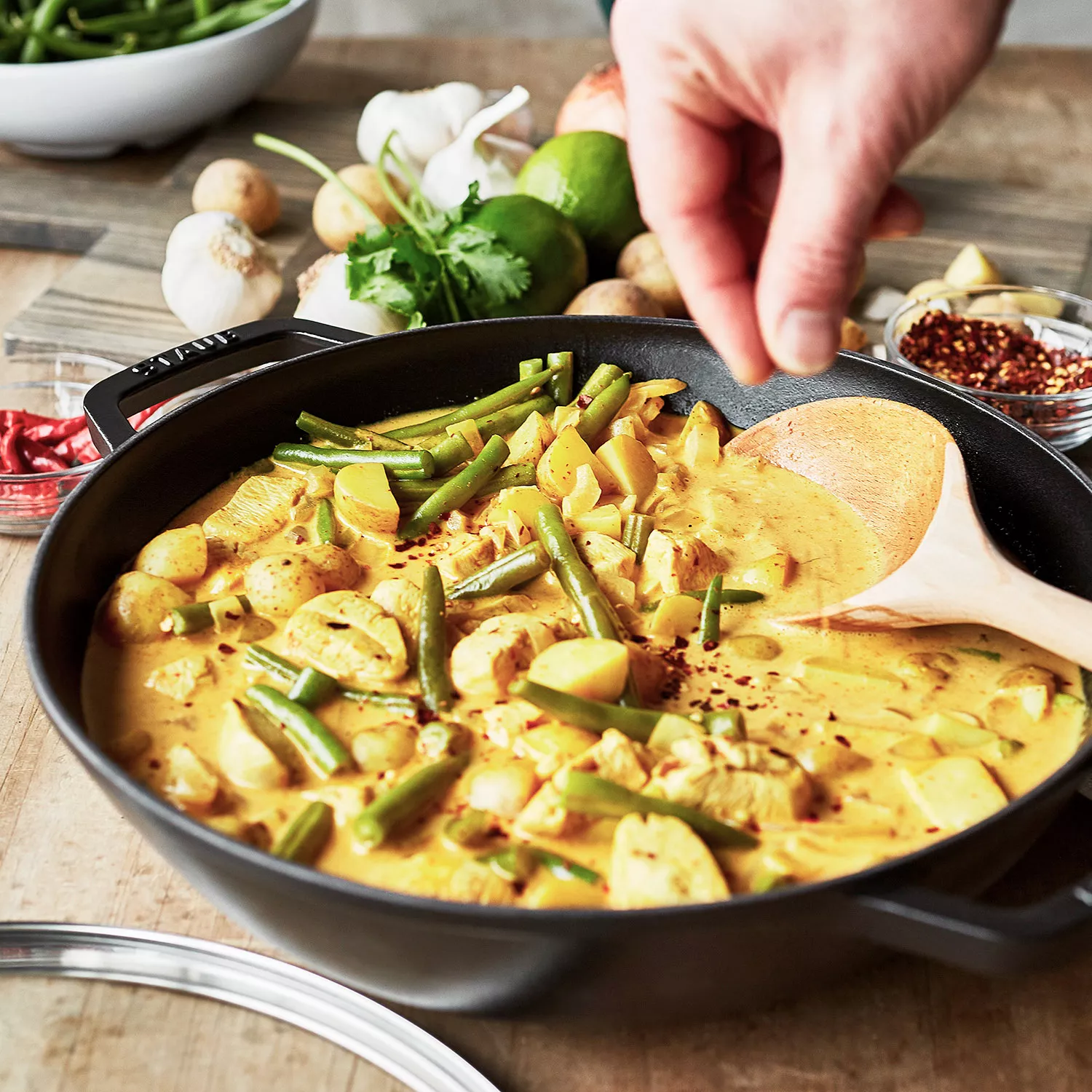 Preheat the perfect pan over medium high heat. Add oil and onions and sauté until translucent. Add garlic and stir for a minute. Add yellow curry paste and stir for another minute. Add chicken and stir until coated with curry paste mixture.