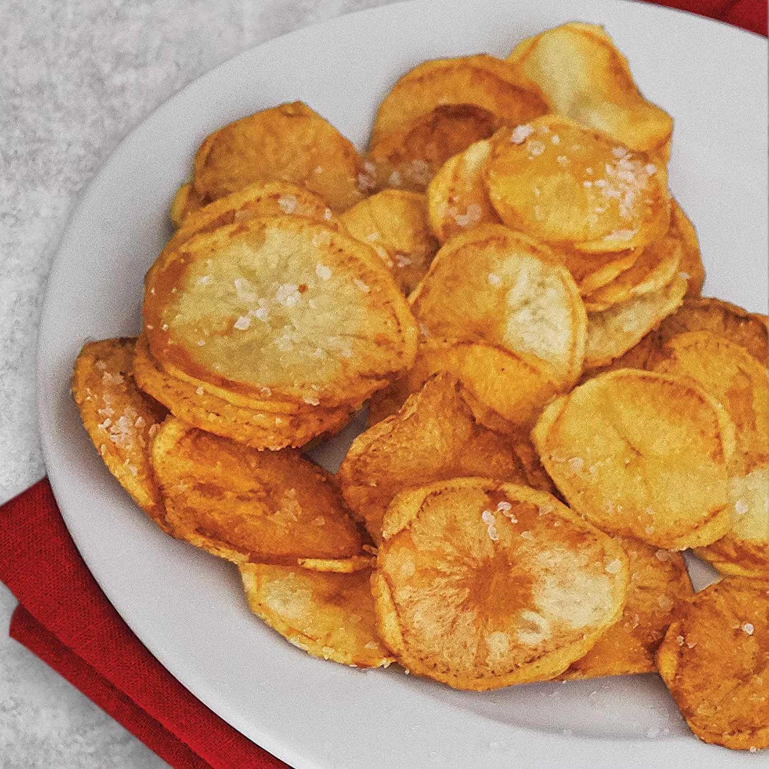 In a large saucepot heat canola oil up to 280°F and add a few slices to the oil at a time. Too many cools the oil too much; add just enough to cover the surface area of the oil. Let fry slowly and occasionally mix in the oil to make sure they fry evenly.