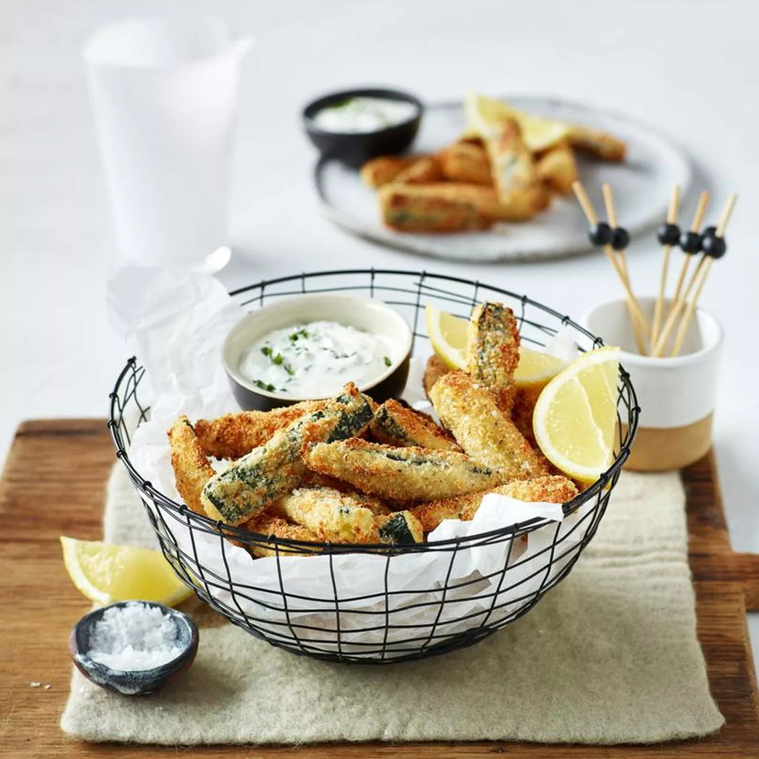 Working with a few zucchini wedges at a time, coat the zucchini in the flour mixture, dusting off any excess, dip in the egg whites then breadcrumbs, pressing on the crumbs, ensuring all sides are well coated. Place on a plate. Continue until all the zucchini wedges are coated.